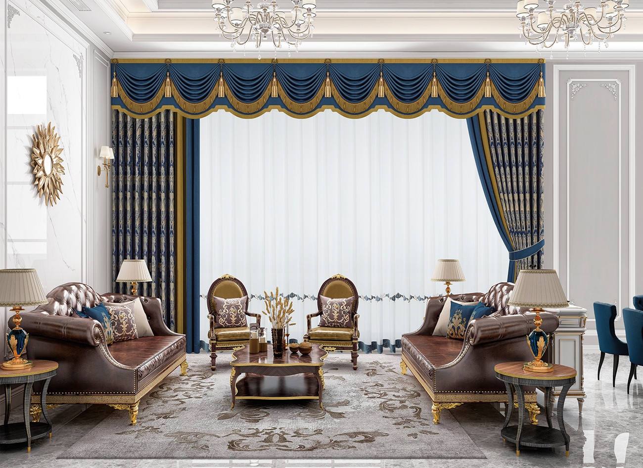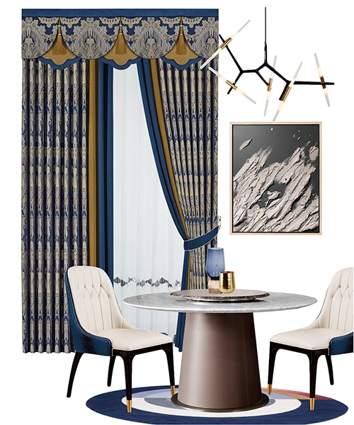 結(jié)合復(fù)古和摩登的設(shè)計靈感,大氣的歐花紋樣復(fù)刻懷舊,簡化的水波簾映射簡約,色彩端莊內(nèi)斂,空間達(dá)成和諧統(tǒng)一的狀態(tài)。