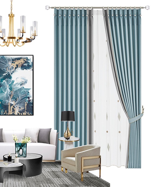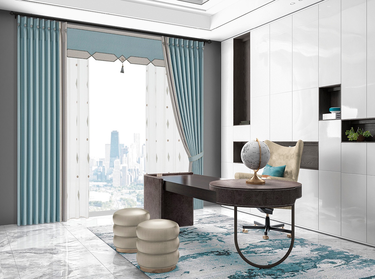現(xiàn)代簡約的素凈表象,潛藏著厚重內(nèi)里。布藝的肌理感賦予灰藍色高級質(zhì)感,不沾染一絲塵埃的干凈模樣讓空間觀感舒朗起來;簡潔的平幔簾頭,配合簡練的幾何圖案,恰到好處的垂墜感,打造恬然而優(yōu)雅的家居風(fēng)情。