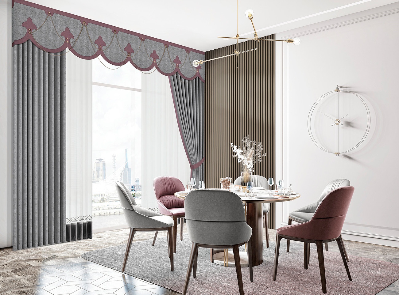 自帶紋理的莊重?zé)熁疑路鹗侵惺兰o(jì)古堡中歷經(jīng)歲月的大理石,赭石色的鳶尾花圖案延續(xù)著色彩帶來的優(yōu)雅體驗,流暢的弧形簾頭訴說著古典美學(xué)的魅力。別出心裁的金色鏈飾更彰顯著歐洲皇室般的高貴氣質(zhì),優(yōu)美而不繁復(fù),簡約而清麗。